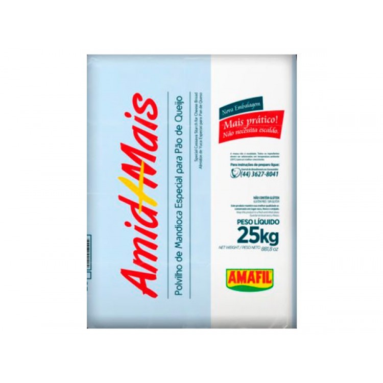 Detalhes do produtoPolvilho Especial para Pão de Queijo em pacote de 1kg e 25kg.O AmidMais de 1 kg foi desenvolvido para o consumidor que não abre mão da qualidade e do sabor do pão de queijo.Há ainda a possibilidade de incrementar a receita de acordo com a sua preferência, com mais praticidade, eliminando a etapa do escaldo.O AmidMais de 25 kg foi desenvolvido especialmente para o profissional de panificação e é comercializado em três variáveis: AmidMais 25, 50 e 75.AmidMais 25 - É indicado para a fabricação de massa de pão de queijo resfriado (massa de balde).AmidMais 50 - É indicado para o preparo de misturas prontas, pão de queijo e biscoito de queijo congelados ou assados na hora, proporcionando maior volume ao alimento.AmidMais 75 - É indicado para o preparo de misturas prontas, pão de queijo e biscoito de queijo congelados ou assados na hora...
